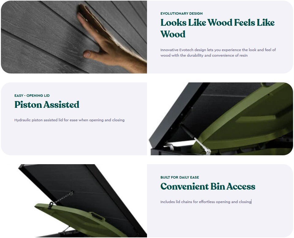 Keter’s Hideaway storage units blend modern design with smart functionality. They maintain their stylish look year after year with zero maintenance – no rust, peeling, rotting, or fading. Built with durable aluminum and steel frames, they offer exceptional strength. Our base model includes two units for two bins, ideal for sorting recycling or accommodating high waste volumes. Each unit opens individually and features a piston mechanism that lifts both the unit top and bin lid simultaneously for effortless access.