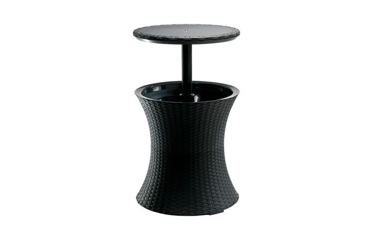 Light up any BBQ or party with the Illuminated Cool Bar, a trendy looking cocktail table and drinks cooler with LED lighting. Simply raise the lid to use it as a table top and fill the cooler portion with ice and drinks and you are set for a chilled time with family and friends. The ice bucket base features double wall insulation to keep drinks ice cold, and comes with a drainage plug to facilitate emptying after use. A simple rotate and lock system keeps the table top stable when extended. Made from durable and weather resistant resin, the illuminated cool bar will maintain its chic appearance, come rain or shine.