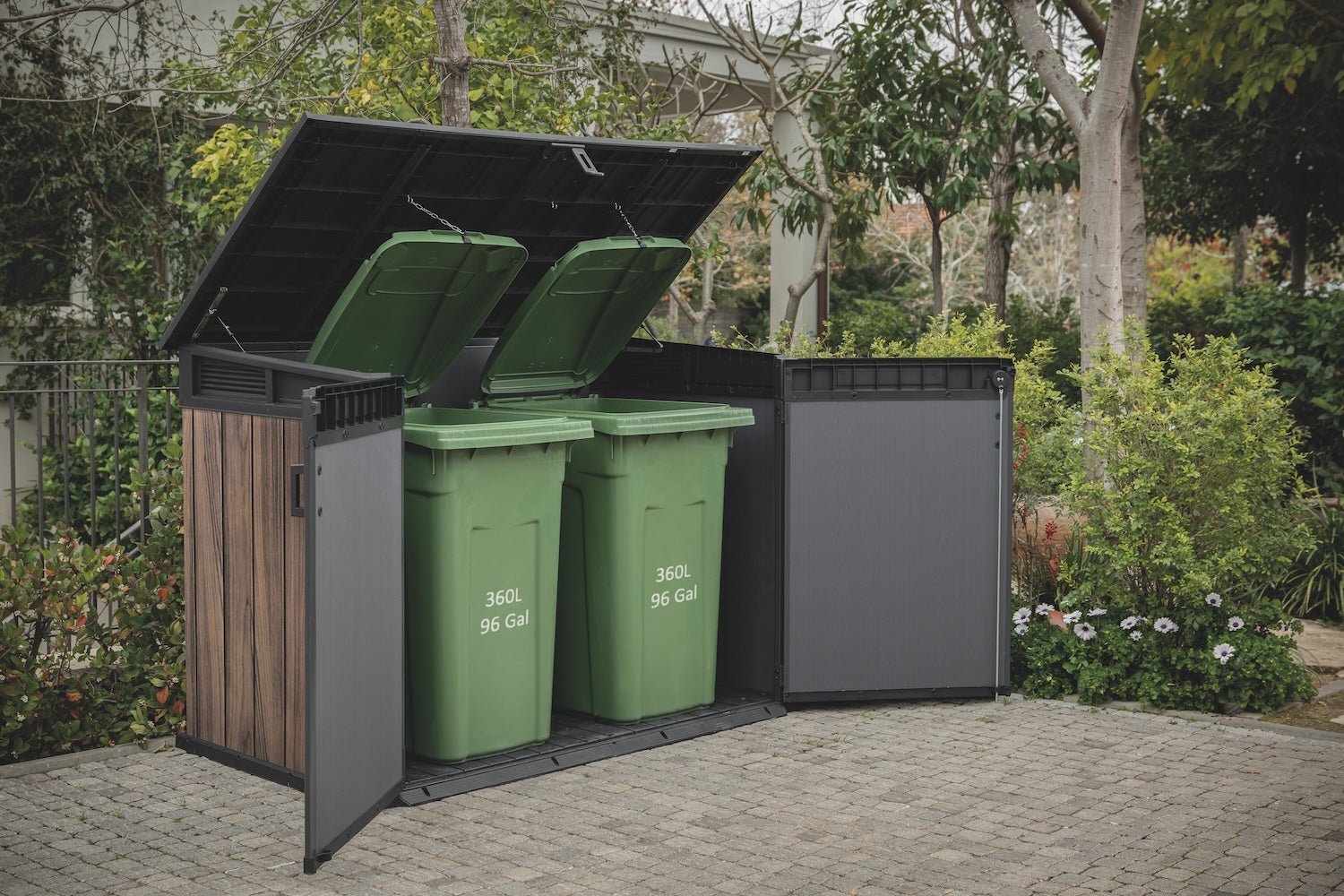 - Spacious Design: Durable & long-lasting double doors with 2020L of interior space, it comfortably accommodates two 360L or three 240L garbage cans, plus additional items like bikes and gardening tools.
