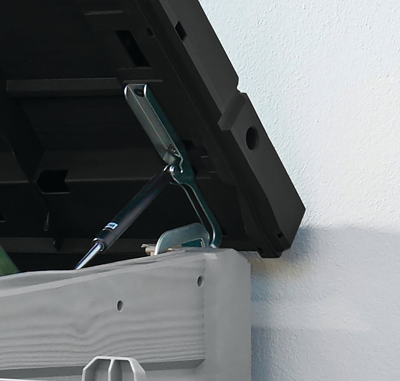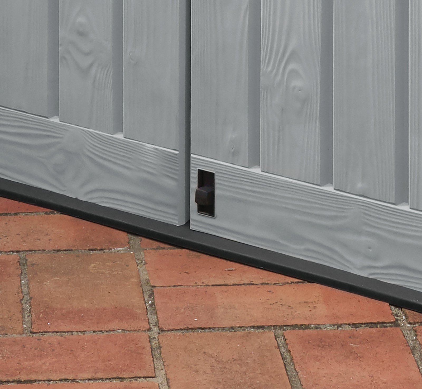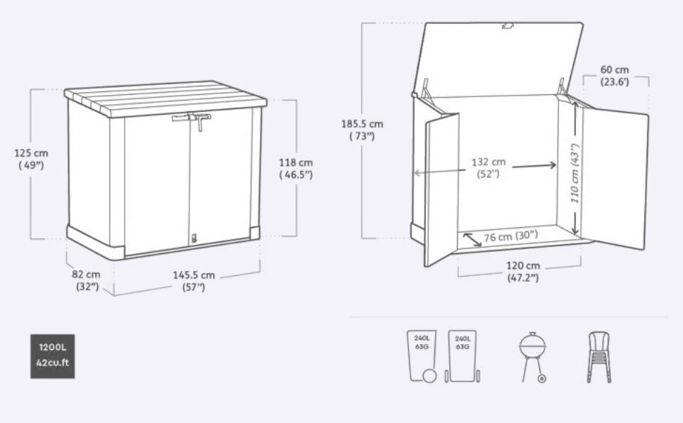 The Store It Out Max is a durable, fully weather resistant storage shed with sloped threshold for easy wheeled access. Features include a 1200lt capacity, easy to open gas strut assisted lid, lockable double doors, floor panel and bonus bin opening kit.